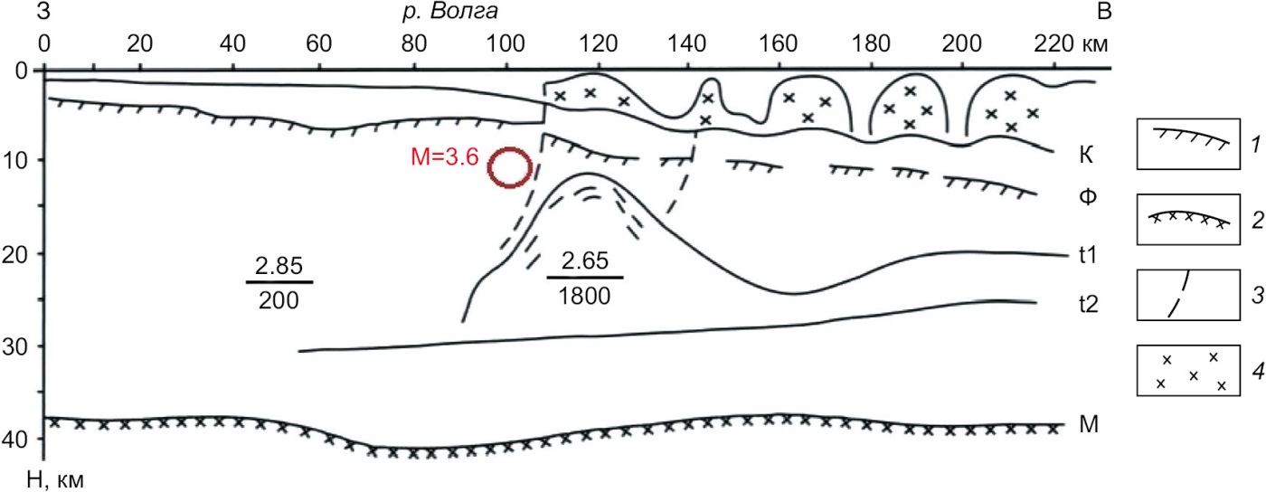 1 – поверхность кристаллического фундамента; 2 – поверхность мантии; 3 – разрывные нарушения; 4 – соленосные толщи. К – поверхность подсолевых отложений, Ф – поверхность кристаллического фундамента, t1 и t2 – границы внутри кристаллического фундамента, М – поверхность мантии. Красным кружком показан гипоцентр Камышинского землетрясения с магнитудой 3.8. На профиле в числителе дроби показаны значения плотности, в знаменателе – значения магнитной восприимчивости в единицах системы СИ.