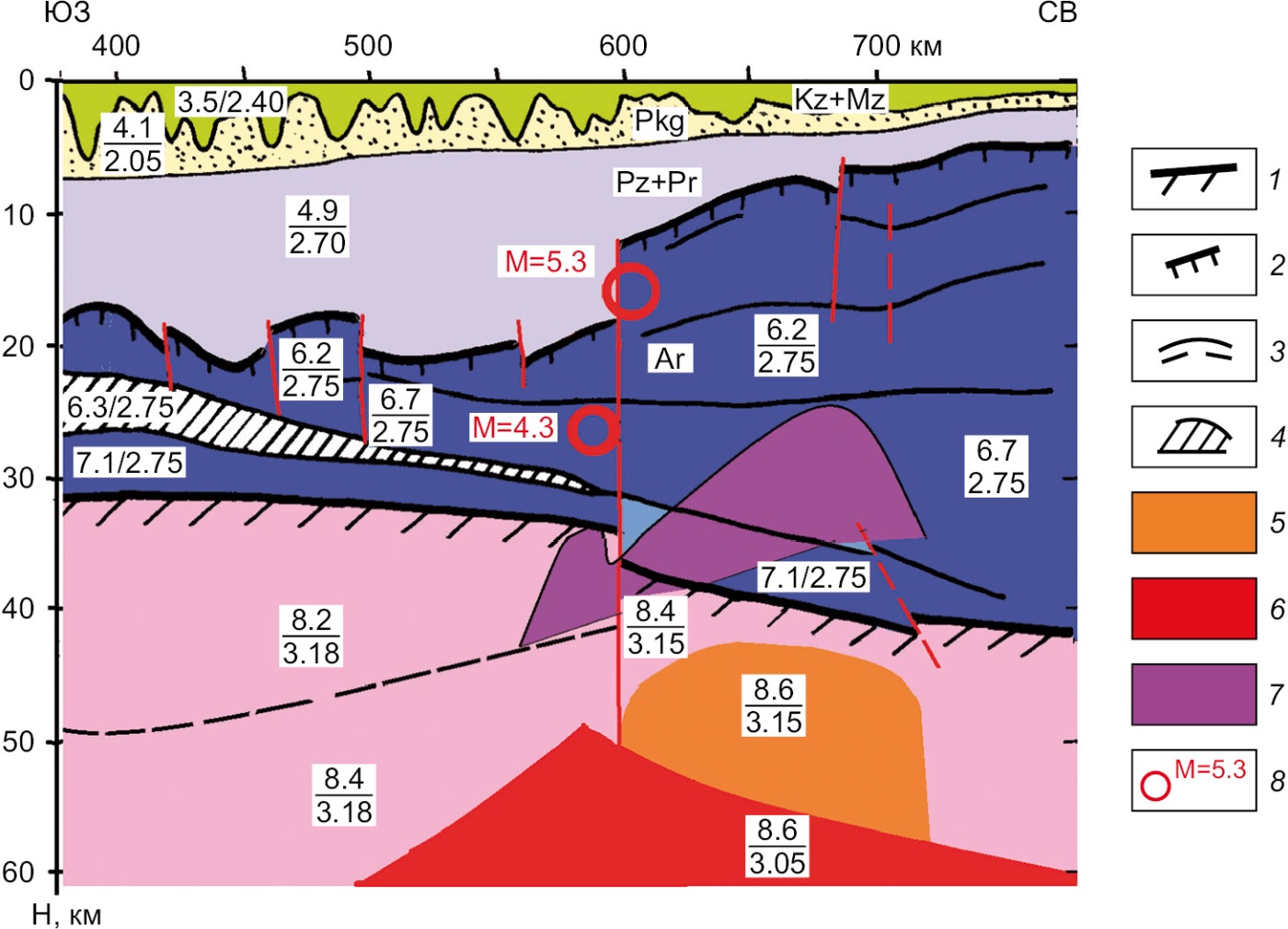 1 – поверхность мантии; 2 – поверхность кристаллического фундамента; 3 – сейсмические границы; 4 – слои пониженных скоростей сейсмических волн; 5 – блок повышенных скоростей сейсмических волн; 6 – блок пониженной плотности; 7 – блок повышенной электропроводности; 8 – гипоцентры землетрясений с указанием магнитуды. Остальные условные обозначения см. на рис. 4.