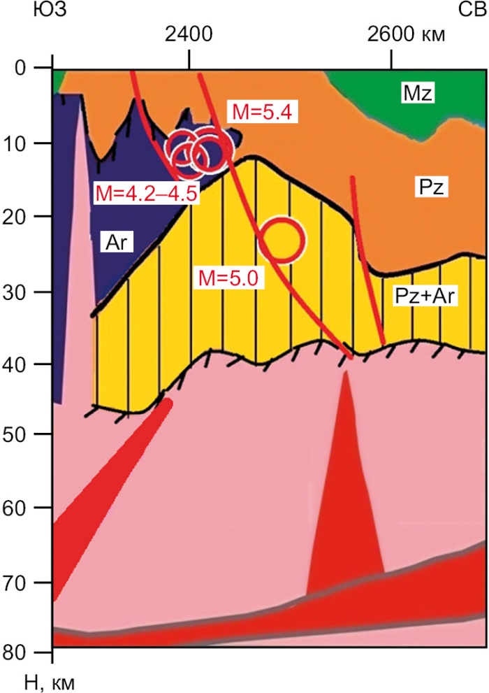 Рис. 6. Модель глубинного строения очаговой зоны уральских землетрясений.