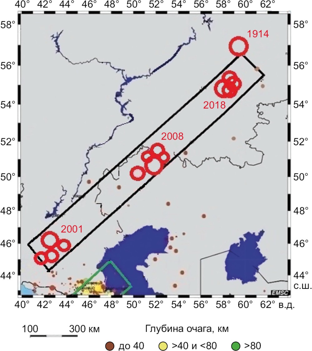 The contour of the Scythian-Ural zone is shown in black, the contour of the northeastern end of the Cyprus-Caucasus seismogenerating zone is shown in green. The red circles show earthquakes with a magnitude of 3.6 or higher. The brown, yellow and green dots represent seismicity according to the EMSC data.