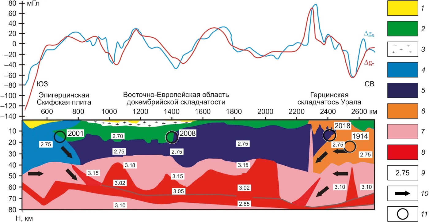 Породы осадочной толщи: 1 – мезокайнозойского возраста, 2 – палеозойского возраста, 3 – соленосные толщи. Породы кристаллического фундамента: 4 – эпигерцинского возраста, 5 – архей-протерозойского возраста, 6 – герцинского возраста. Породы мантии: 7 – нормально уплотненные, 8 – разуплотненные, 9 – значения плотности; 10 – направления движения литосферных мегаблоков; 11 – гипоцентры сильных землетрясений магнитудой 5 и более с указанием года: Сальского – ПК 700, Шалкарского – ПК 1400, Билимбаевского и Уральского – ПК 2400 – 2500. ∆gБ – кривая гравитационного поля в редукции Буге, ∆gТ – рассчитанная кривая гравитационного поля.
