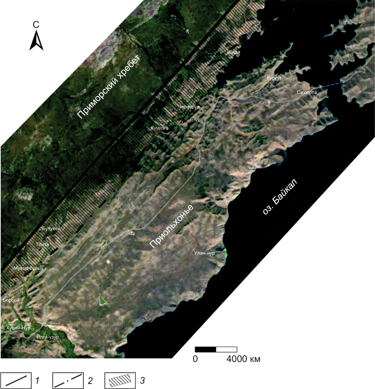 Согласно результатам этих исследований, в региональном плане Приольхонье включает северо-западный и юго-восточный блоки, граница между которыми проходит по Кучулгинскому разлому (рис. 1). Северо-западный блок представлен Чернорудской зоной, или Чернорудско-Баракчинской [Letnikov et al., 1997; Savelyeva, 1998], тектонической зоной (ЧБТЗ). Она образована породами, относящимися к гранулитовой фации метаморфизма, и представлена узкой (до 5 км) и протяженной (более 50 км) структурой северо-восточного простирания, прослеживающейся в северо-западной части Приольхонья в метаморфическом комплексе ольхонской серии, рядом с границей краевого выступа фундамента Сибирской платформы. В работах [Letnikov et al., 1997; Savelyeva, 1998] она описана как пример линейных зон глубинных разломов с проявлением парагенезисов, формировавшихся в восстановительных условиях. Время протекания эндогенных процессов (включая региональный метаморфизм) авторами указанных статей относится к периоду 500–350 млн лет назад. За пределами ЧБТЗ упомянутые признаки глубинной тектонической зоны отсутствуют. На уровне современного эрозионного среза Чернорудская зона располагается в пределах неотектонической структуры, известной как Чернорудский (Бугульдейско-Чернорудский) грабен, или Мухор-Таловский блок [Smolyansky, Gonchar, 2001]. Он представляет собой грабенообразный прогиб, протягивающийся вдоль Приморского разлома от р. Бугульдейка до залива Мухор и далее в Малое Море.