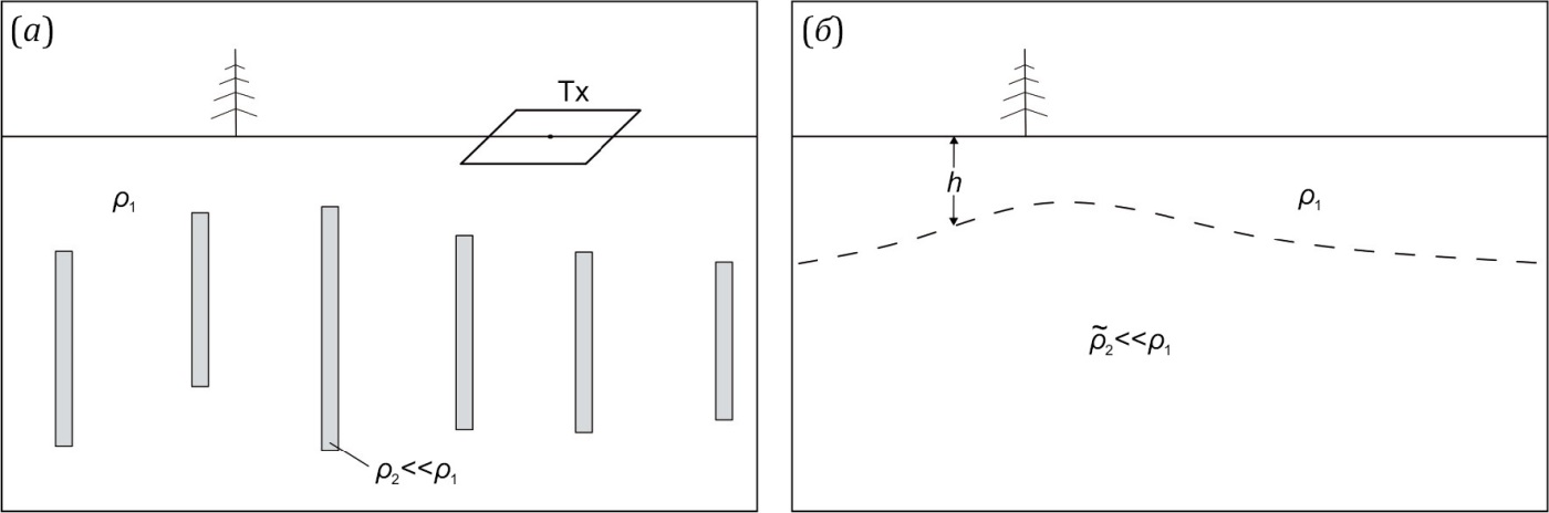 В контексте настоящей статьи важно, что H-эквивалентность проявляется и в тех случаях, когда среда является трехмерной, однако локально может быть представлена горизонтально-слоистой моделью с проводящим промежуточным слоем или основанием. Для таких геоэлектрических моделей глубина до кровли проводника, определенная посредством одномерной инверсии по нисходящей ветви кривой ρτ для симметричной (соосной) установки, близка к истинной [Newman et al., 1987]. Под истинной в данном случае понимается глубина, на которой находится верхняя граница проводящих пород под центром генераторной петли.
