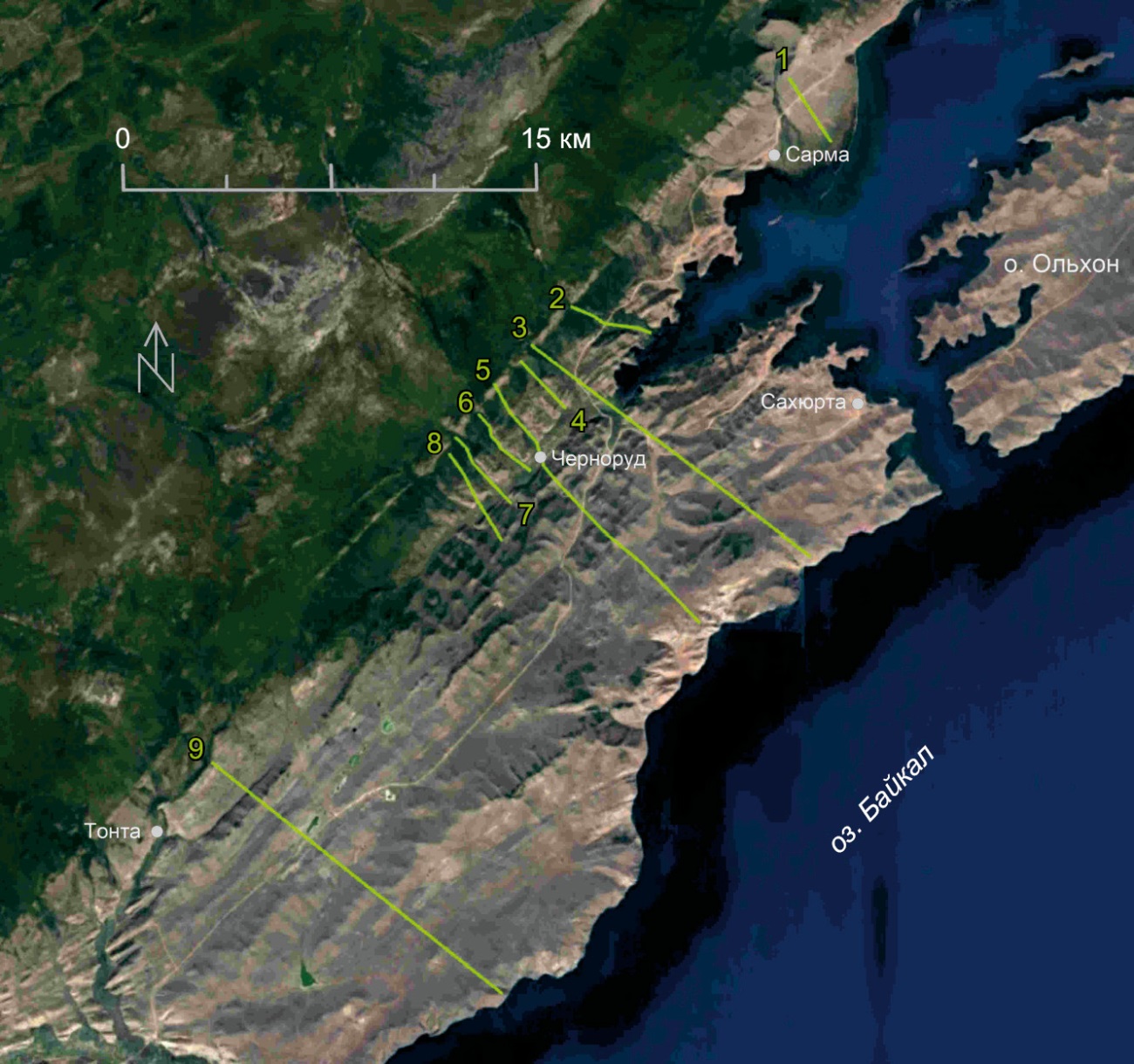 Съемки методом ЕП проводились в рамках НИР и учебных геофизических практик для студентов ИрГТУ. Измерения выполнены способом потенциала вдоль профилей протяженностью от 2.7 до 13.5 км, ориентированных с северо-запада на юго-восток (рис. 7). На всех профилях в качестве референтной использовалась крайняя северо-западная точка, располагавшаяся у подножия уступа Приморского хребта. Измерения на профилях 1–6 выполнены с шагом 50 м, на профилях 7–9 шаг составлял 25 м.