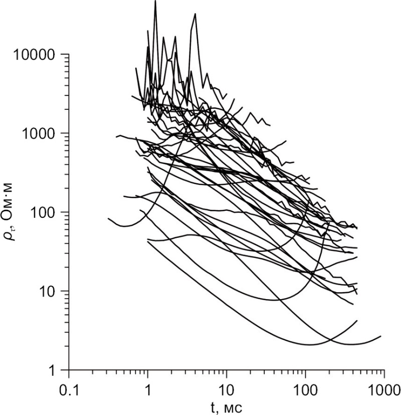 Для большинства кривых ρτ на рис. 3 характерно уменьшение кажущегося УЭС по мере увеличения времени регистрации и, соответственно, эффективной глубины зондирований [Matveev, 1974; Meju, 1995]. По типу эти кривые относятся к наблюдаемым при зондировании двухслойных геоэлектрических разрезов с проводящим основанием или трехслойных разрезов с промежуточным проводящим слоем [Matveev, 1974]. Среди таких кривых выделяются измеренные в Чернорудской зоне (показаны синим цветом), где на поздних временах кажущееся УЭС составляет от единиц до десяти Ом·м. По уровню большинство кривых ρτ (показаны черным цветом) располагаются выше измеренных в Чернорудской зоне. Однако это кривые того же типа, что и характерные для Чернорудской зоны. Это указывает на то, что за ее пределами на глубине также залегают породы с удельным сопротивлением, намного более низким, чем у пород вышележащей толщи.