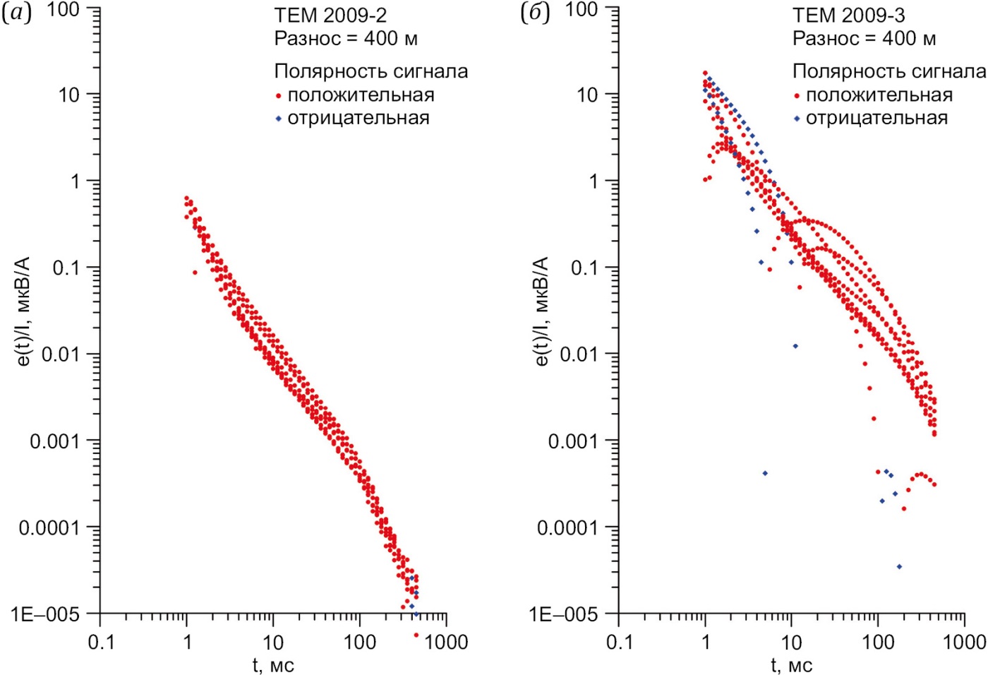 Рис. 5. Индукционные переходные характеристики, измеренные вблизи побережья оз. Байкал (а) и в Чернорудской зоне (б). Красным цветом показаны положительные, синим – отрицательные значения ЭДС, приведенные к току в генераторной петле. Генераторная петля 500×500 м, приемная – 18×18 м. Расстояние между центрами генераторной и приемной петель 400 м.