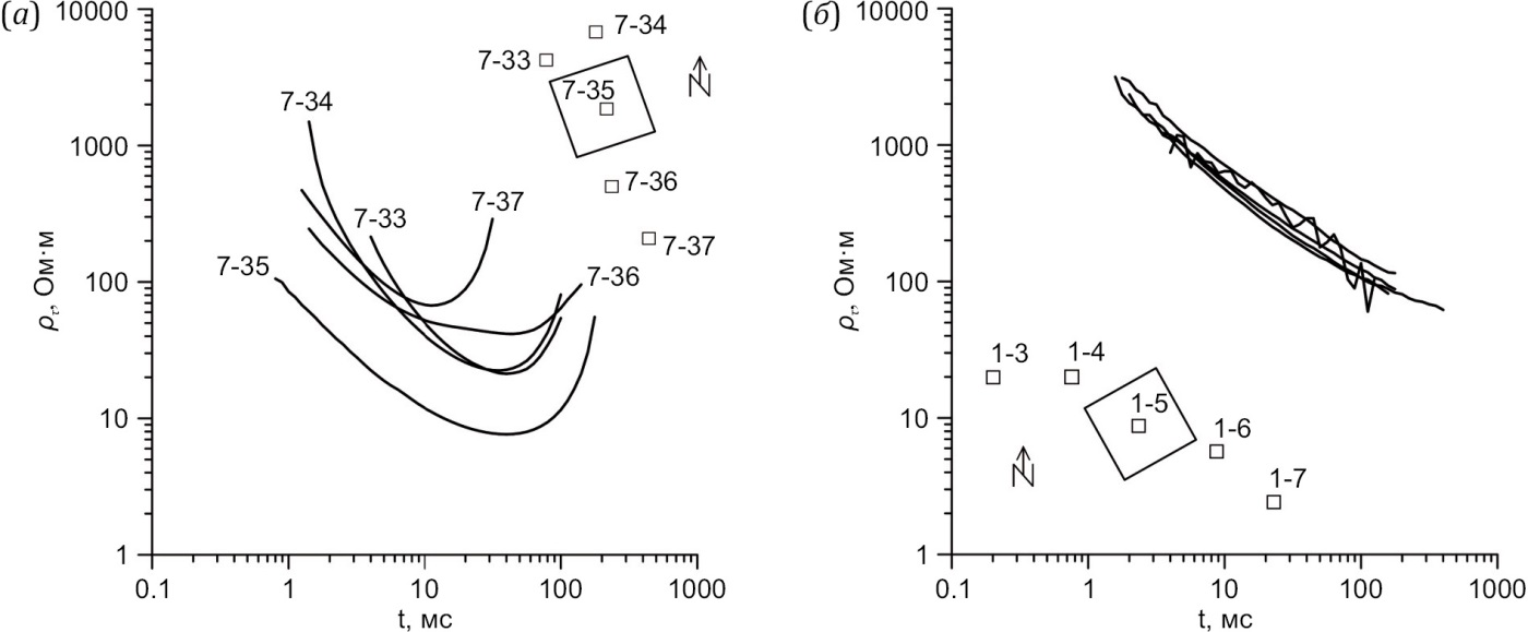 На рис. 4, а, изображена генераторная петля размером 400×400 м (ее центр на рис. 2 отмечен номером 4–7) и приемные петли размером 18×18 м. Здесь же приведены кривые кажущегося удельного сопротивления, форма и уровень которых демонстрируют сильную зависимость от положения приемной петли. Это указывает на то, что геоэлектрический разрез здесь отличается от горизонтально-слоистого.