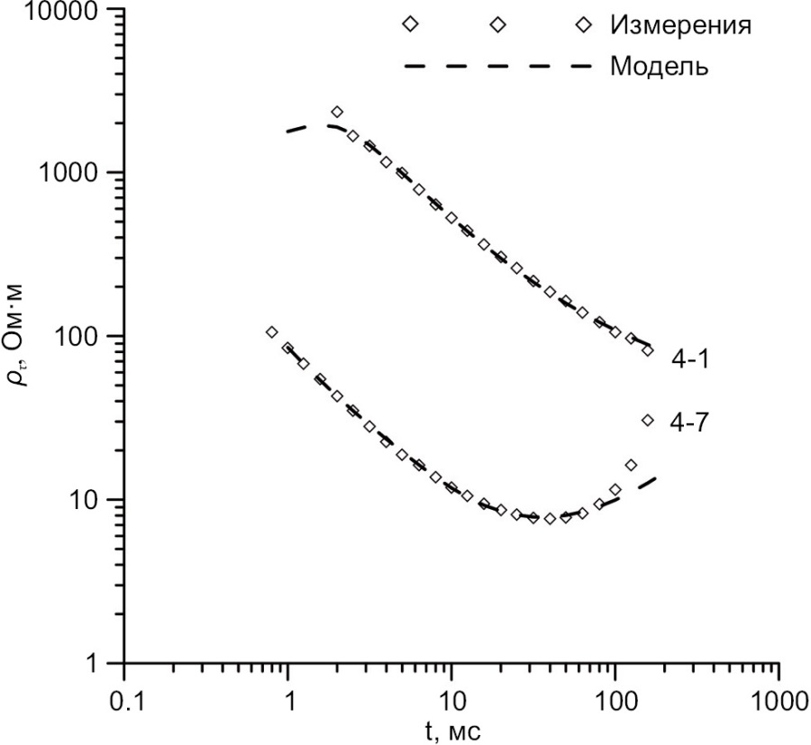 Рис. 6 иллюстрирует возможности инверсии индивидуальных кривых кажущегося удельного сопротивления на основе горизонтально-слоистой модели. На рисунке приведены экспериментальные и модельные кривые ρτ для зондирований 4-1 и 4-7 (см. рис. 2). Измерения выполнены соосной установкой с генераторной петлей размером 400×400 м. Модельная кривая ρτ для зондирования 4-1 рассчитана для двухслойного разреза с проводящим основанием: ρ1=1460 Ом·м, H1=1530 м, ρ2=35 Ом·м; кривая 4-7 – для трехслойной среды с промежуточным проводящим слоем: ρ1=1280 Ом·м, H1=153 м, ρ2=3.6 Ом·м, H2=240 м, ρ3=2000 Ом·м.