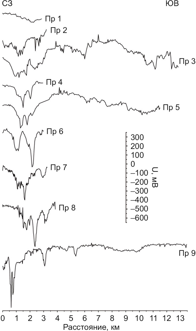 На остальных профилях (1, 2, 4, 6–8), как и на северо-западном фланге профилей 3, 5, 9, наблюдаются интенсивные отрицательные аномалии, которые включают от одного (Пр1) до трех (Пр8) минимумов. По мере продвижения с северо-востока на юго-запад амплитуда аномалий, оцениваемая по разнице между максимальным и минимальным значением потенциала на профиле, увеличивается от 130 до 850 мВ.