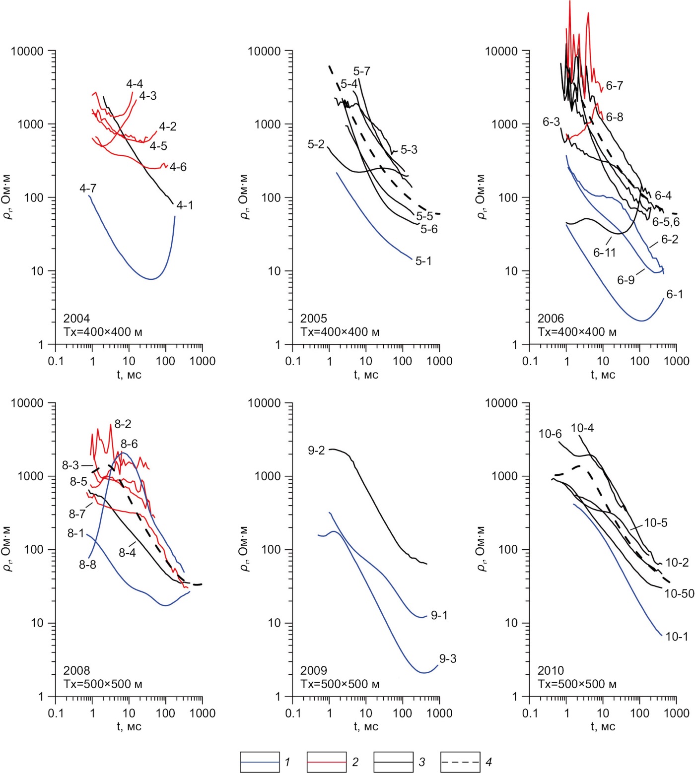 Кривые кажущегося удельного электрического сопротивления ρτ для установок Qq приведены на рис. 3. Кривые объединены в группы в соответствии с годом, когда проводились измерения. Как можно видеть, наблюдаются отличия индивидуальных кривых ρτ в пределах каждой группы, а также между группами в целом. Это указывает на неоднородное геоэлектрическое строение исследуемого участка земной коры и ограниченные возможности интерпретации данных ЗСБ на основе модели горизонтально-слоистой среды.
